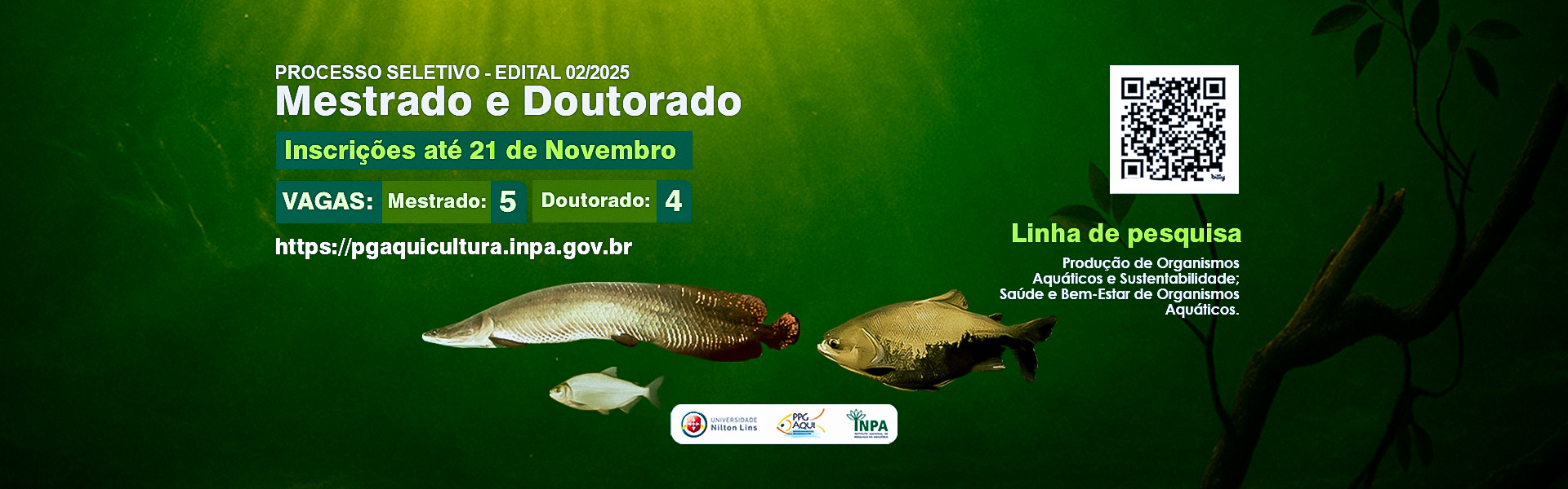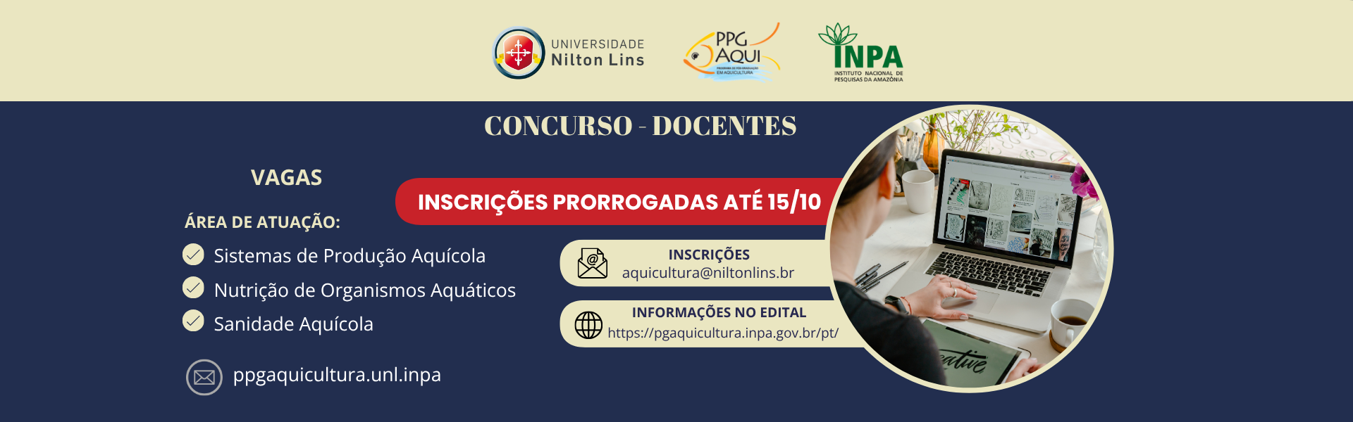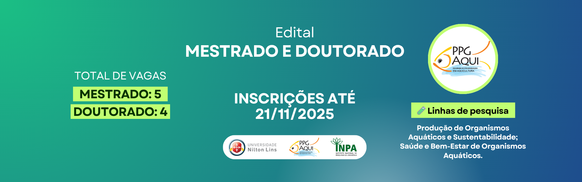 The Postgraduate Program in Aquaculture (PPG-AQUI), coordinated by Nilton Lins University, is offered in broad association with the National Institute for Amazonian Research, in a fruitful partnership that has contributed to the training of high-level human resources. Offering Master`s and Doctorate degrees, the PPG Aquaculture aims to form academic and professional skills in subjects related to biology problems, specific to environments where aquatic organisms are cultivated, training professionals and providing them with adequate knowledge and skills to work in the higher education, in research and development and as managers and consultants in aquaculture.